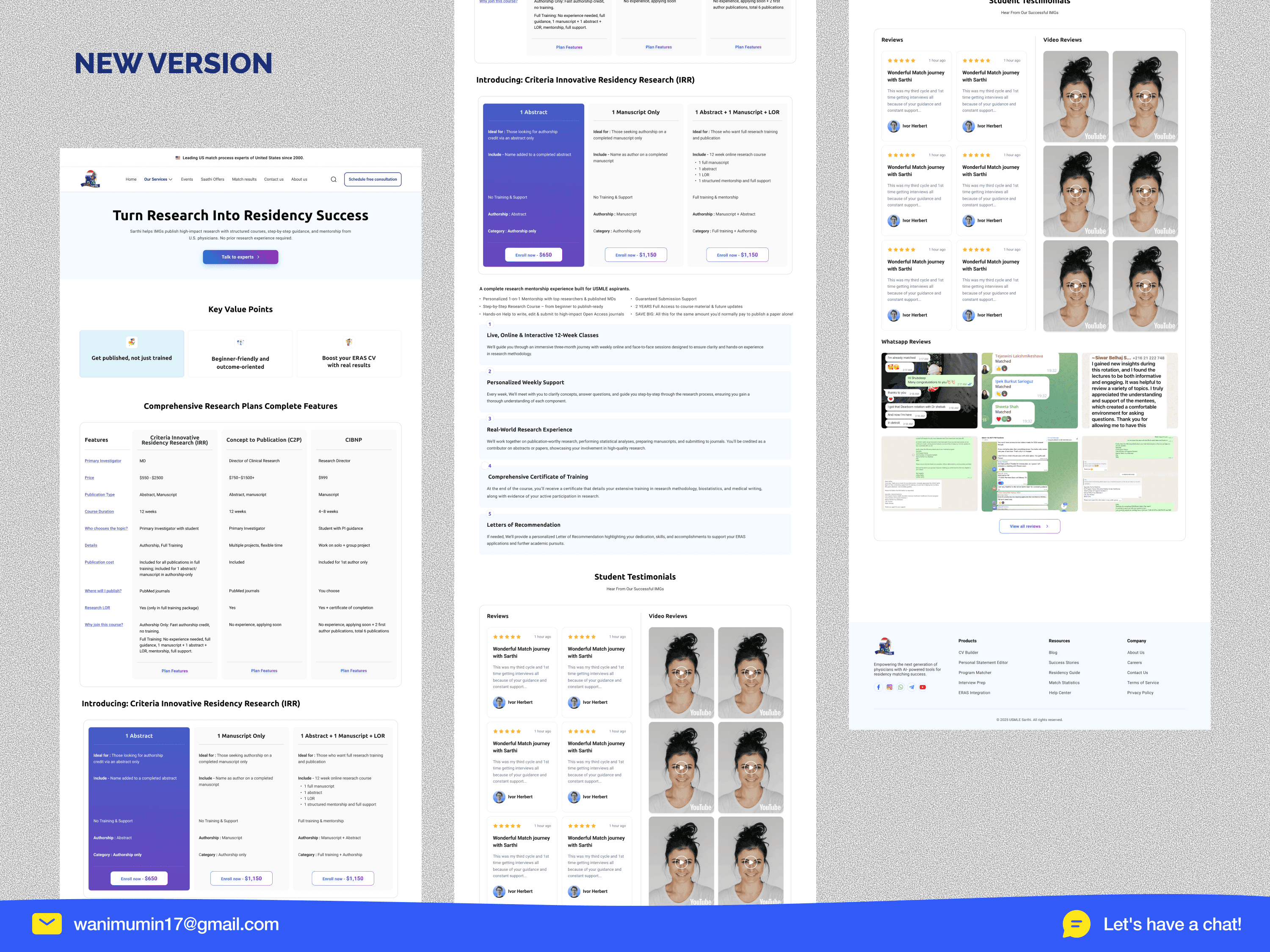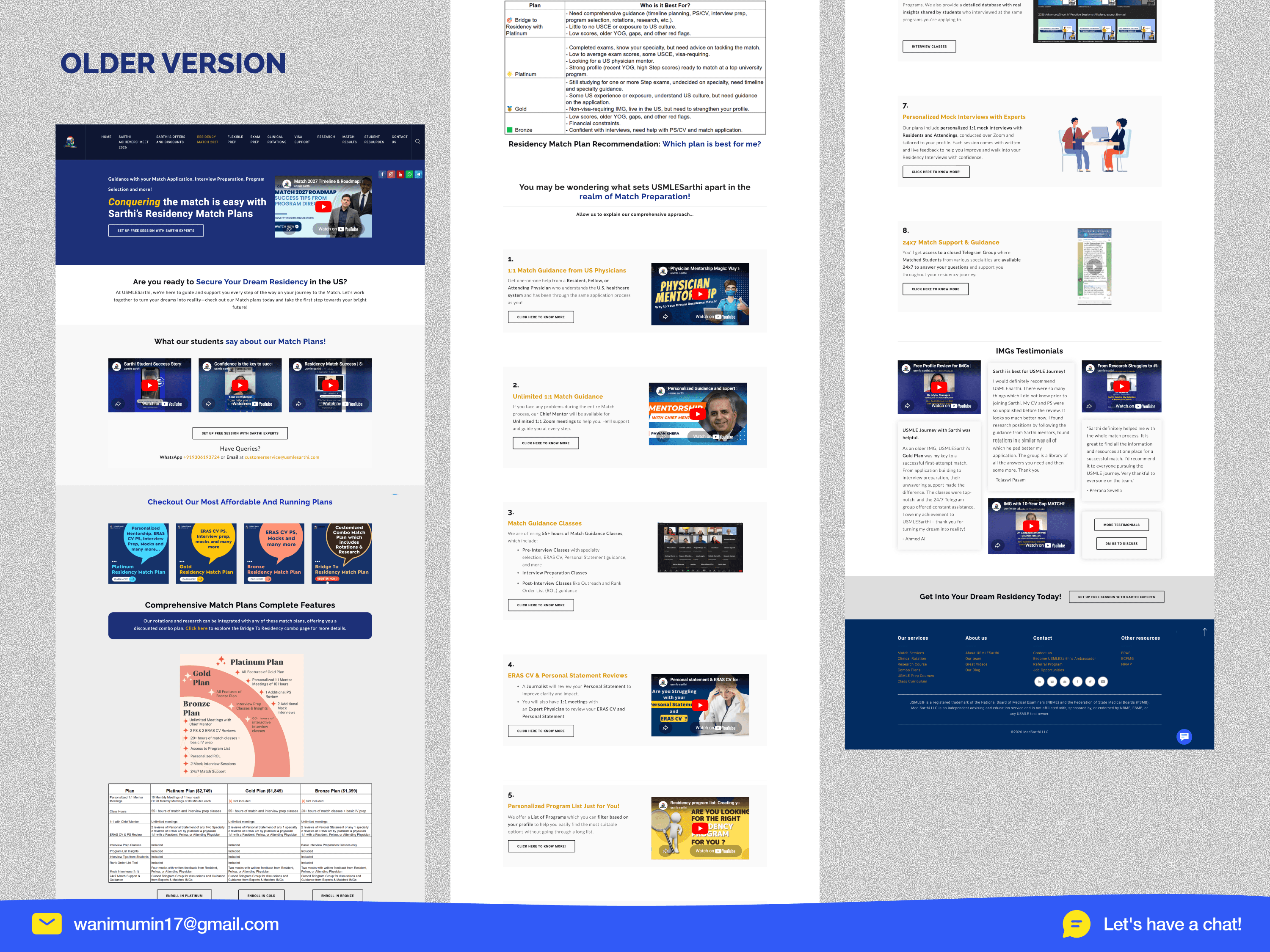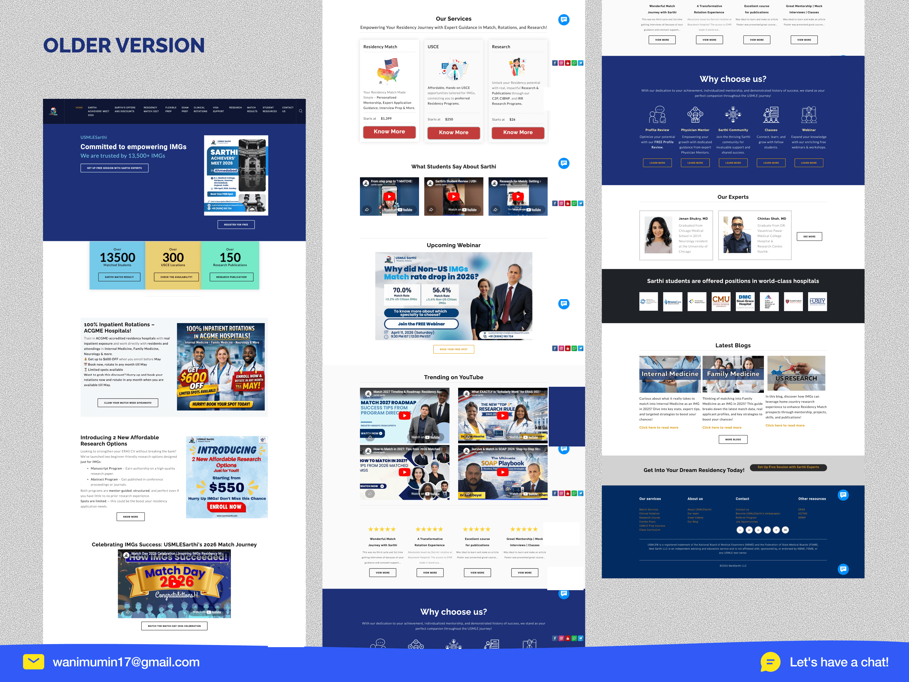 • 13+ navigation items, zero direction. The site tried to show everything at once match services, exam prep, rotations, visa support, research programs, events, blogs, referrals, and contact all in the main nav. A first-time visitor had no idea where to start. For a student making a high-stakes, $2,699 decision under pressure, this navigation was a wall, not a door. • 8 competing CTAs destroying conversion. A single page had "Set Up Free Session," "Register for Free," "Claim Giveaways," "Know More" (repeated 3 times), "Enroll Now," and "Book Now" all competing for the same click. When everything is a priority, nothing is. The site didn't know what it wanted users to do, so users did nothing. • Incredible proof hidden in plain sight. 500+ matched students. Partnerships with Harvard, Mount Sinai, Beaumont. 13,500+ students served. Real WhatsApp testimonials. Real video reviews. All of it buried below 3+ scrolls, scattered randomly, mixed in with promotional banners and YouTube embeds. The most convincing content on the site was the hardest to find.