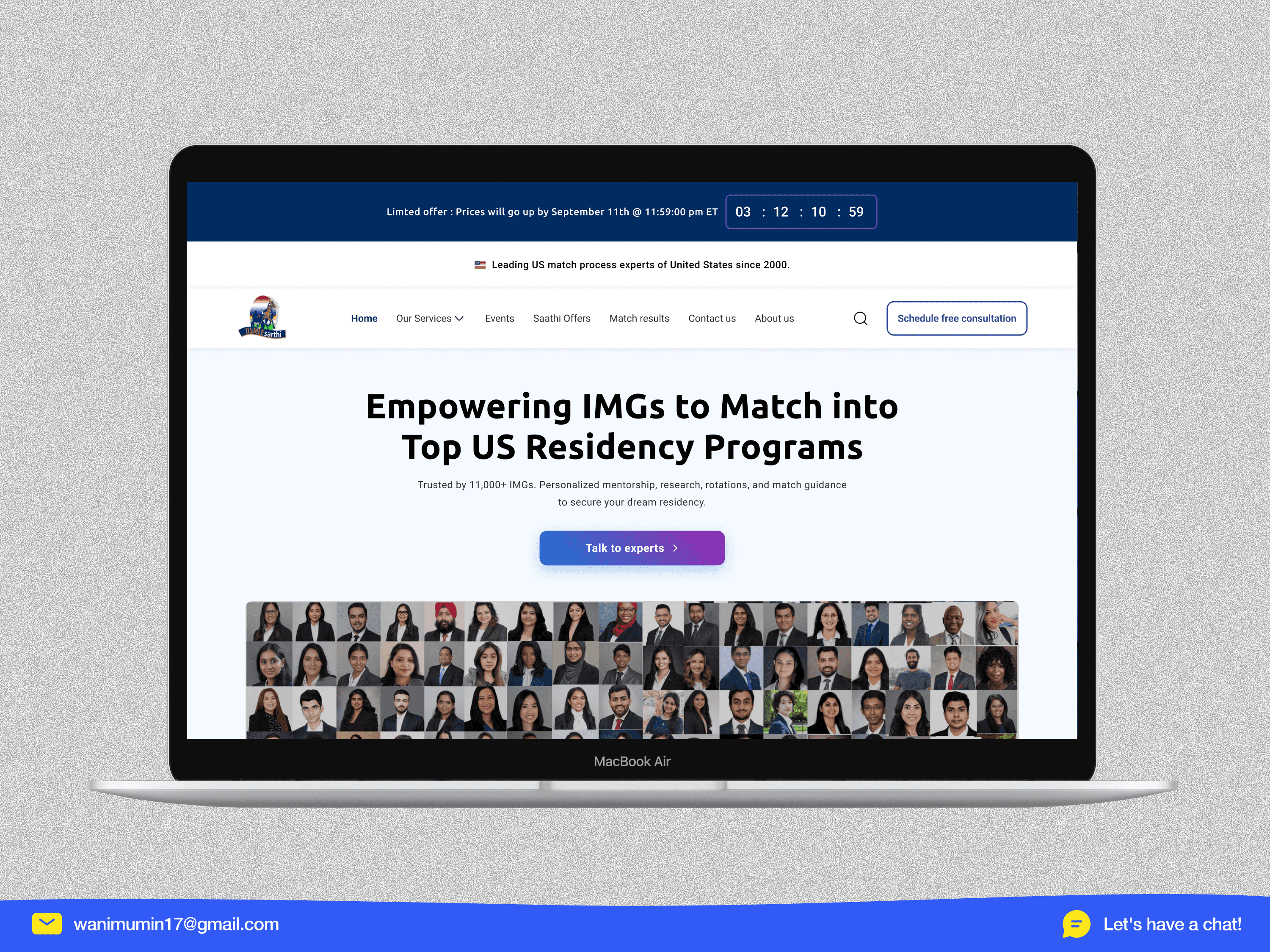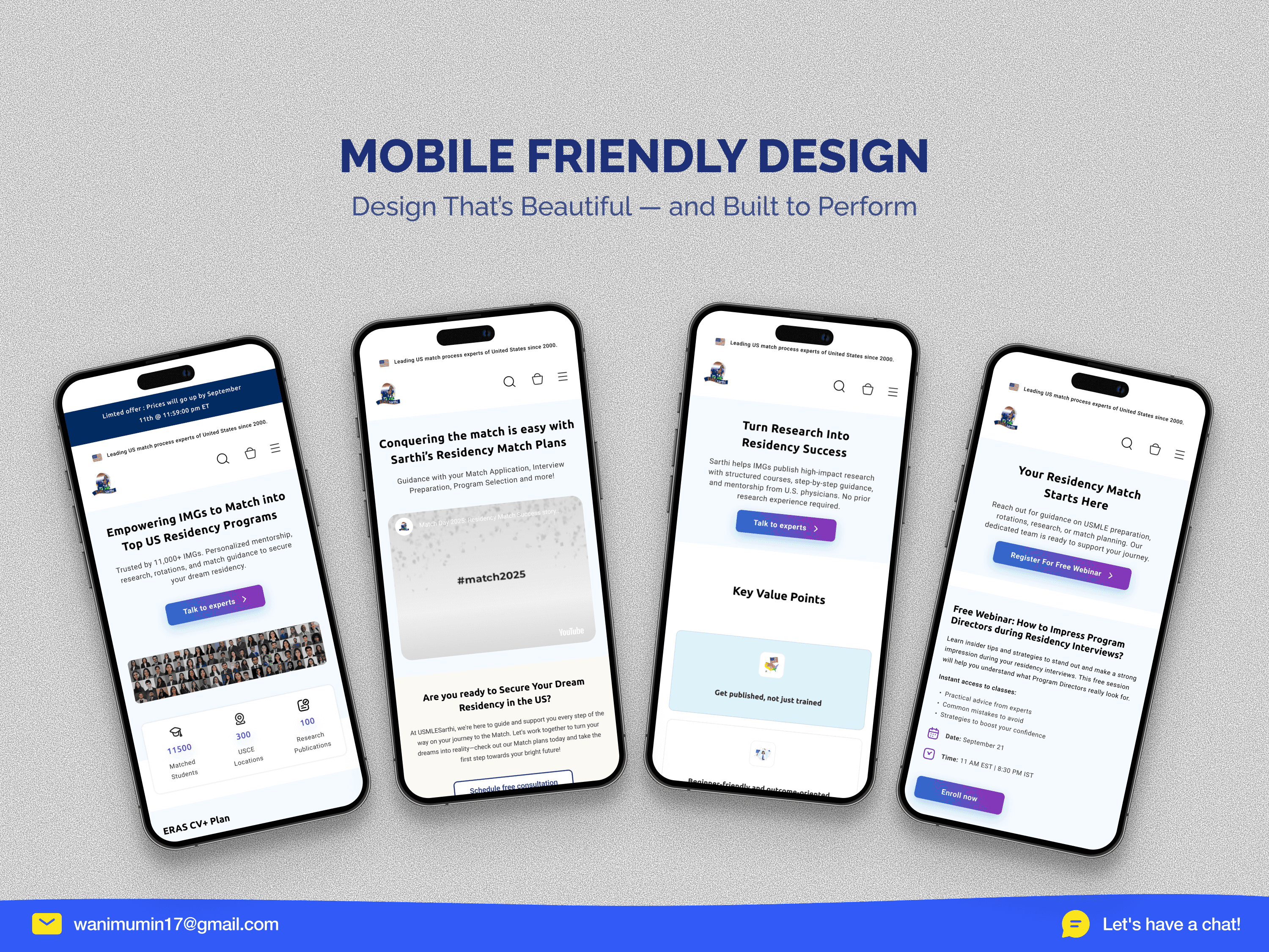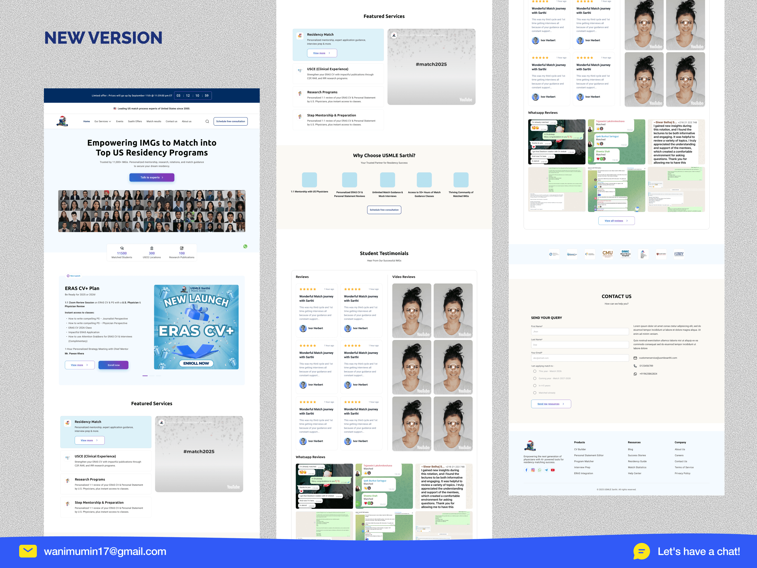 • 13+ navigation items, zero direction. The site tried to show everything at once match services, exam prep, rotations, visa support, research programs, events, blogs, referrals, and contact all in the main nav. A first-time visitor had no idea where to start. For a student making a high-stakes, $2,699 decision under pressure, this navigation was a wall, not a door. • 8 competing CTAs destroying conversion. A single page had "Set Up Free Session," "Register for Free," "Claim Giveaways," "Know More" (repeated 3 times), "Enroll Now," and "Book Now" all competing for the same click. When everything is a priority, nothing is. The site didn't know what it wanted users to do, so users did nothing. • Incredible proof hidden in plain sight. 500+ matched students. Partnerships with Harvard, Mount Sinai, Beaumont. 13,500+ students served. Real WhatsApp testimonials. Real video reviews. All of it buried below 3+ scrolls, scattered randomly, mixed in with promotional banners and YouTube embeds. The most convincing content on the site was the hardest to find.