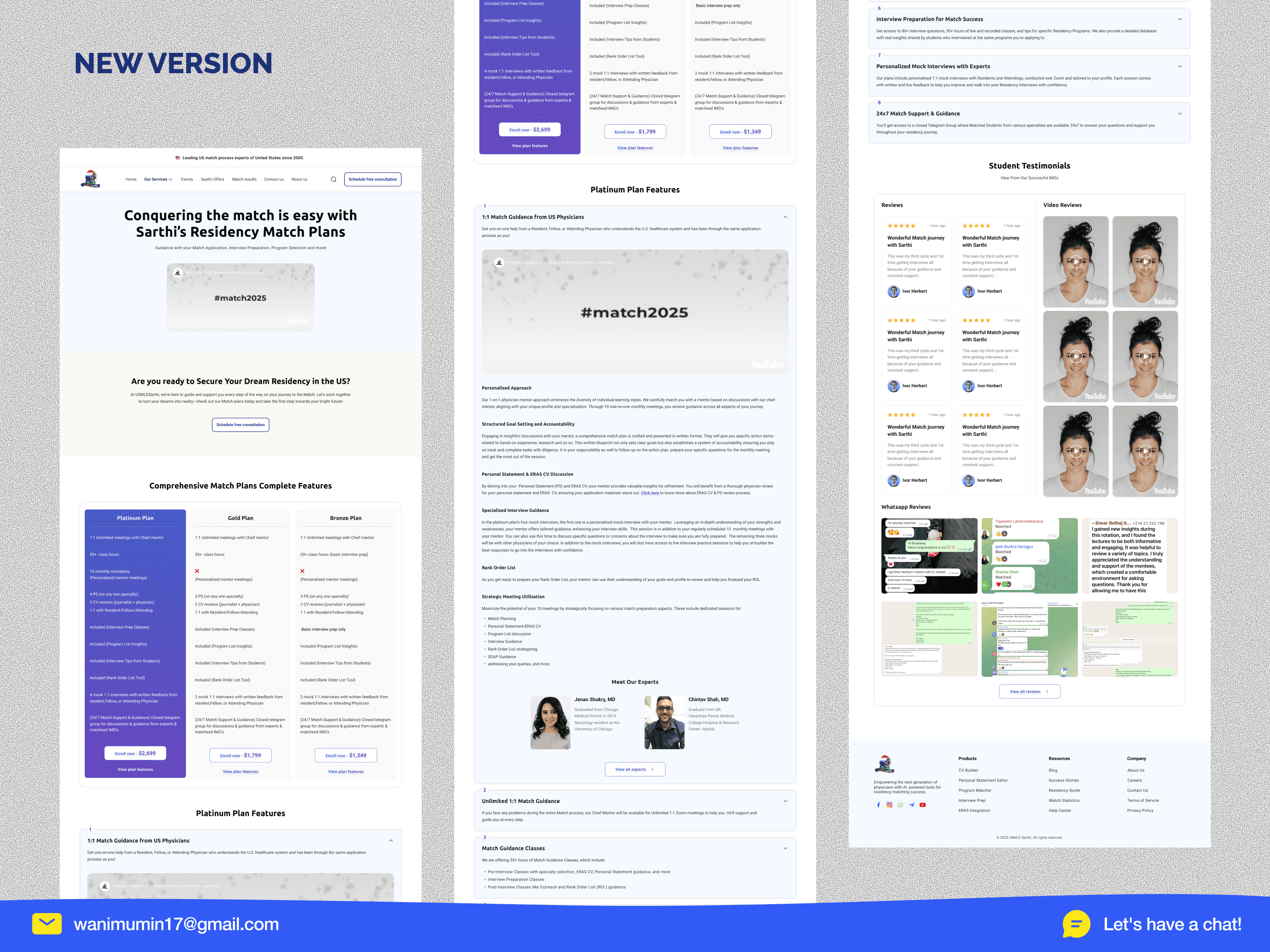 • Navigation cut from 13 to 7 items (46% simpler). Restructured the entire information architecture. Pulled "Schedule Free Consultation" out of the nav and made it a persistent header button always visible, always one click away. Pricing consolidated from 4 separate pages into one side-by-side comparison view (Platinum / Gold / Bronze), eliminating the need to visit multiple pages to make a decision. • Trust moved above the fold, organized by proof type. Social proof now appears in three formats written reviews with star ratings, video testimonials, and raw WhatsApp screenshots each addressing a different trust threshold. Match results categorized into 6 student-specific groups (Old YOG, Recent YOG, Less IVS, Low Scores, Gap, Visa Seeking) so every visitor finds someone exactly like them who matched successfully. • Consistent design system across 10+ pages. Unified typography, spacing, color system, and reusable components replaced the visual chaos of the old site. Full mobile responsiveness replaced broken table-based layouts. The website now reflects the caliber of a platform trusted by 13,500+ medical graduates and partnered with world-class institutions.